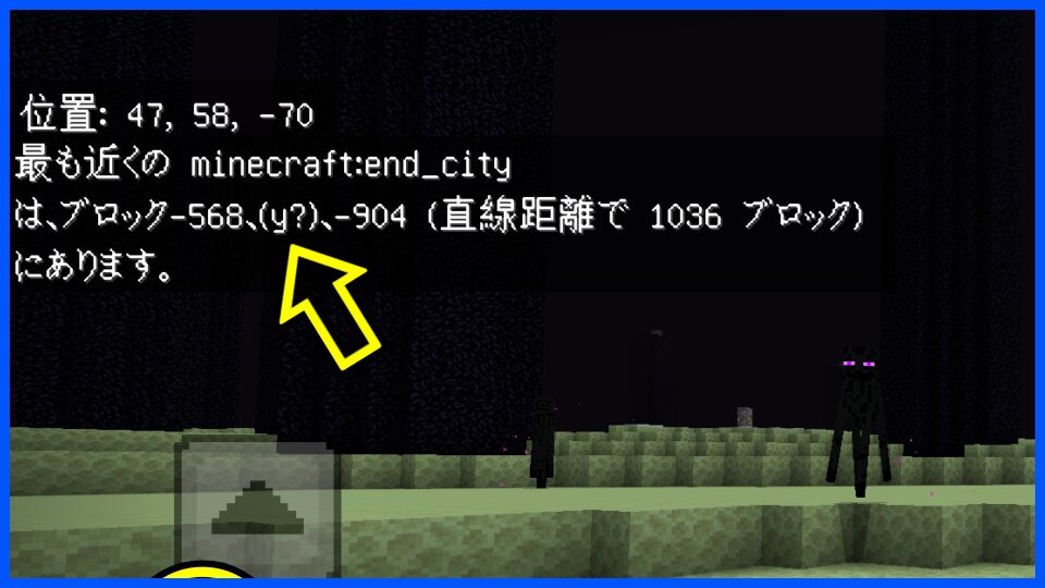 まずは、以下コマンドを入力することで、最も近い前エンドシティの座標が表示されます。(エンドでコマンド入力必須)