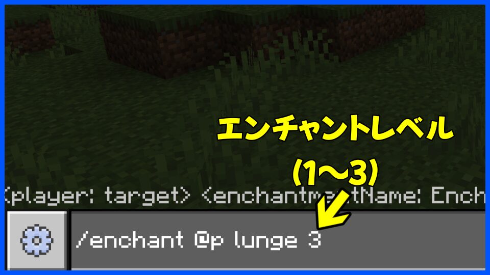 /enchant @p lunge 1@pは最も近いプレイヤーを対象にする指定lungeがランジのID1はレベル(1~3まで指定可能)