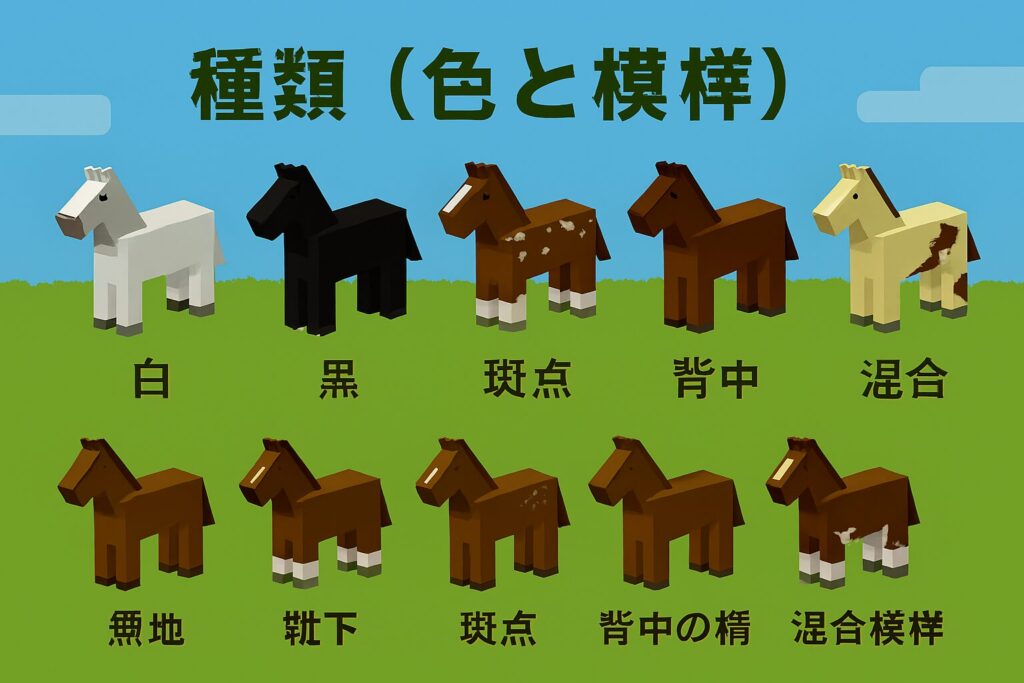 馬は 色 × 模様 の組み合わせで見た目が決まります。理論上は 5色 × 5模様 = 25通りですが、実際には一部の色に追加模様があり、合計で 35種類 のバリエーションが存在します。